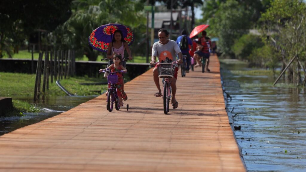 Como o solo permanece alagado grande parte do ano, Afuá não tem ruas convencionais. No lugar delas, extensas passarelas de madeira servem simultaneamente como ciclovias, calçadas e vias de acesso para moradores e visitantes. É por essas passarelas que as bicicletas se multiplicam e fazem parte da paisagem cotidiana do município.