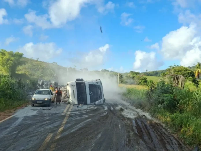 BR-101 interditada: carreta com carga de cimento tomba e impede passagem de veículos nos dois sentidos da pista