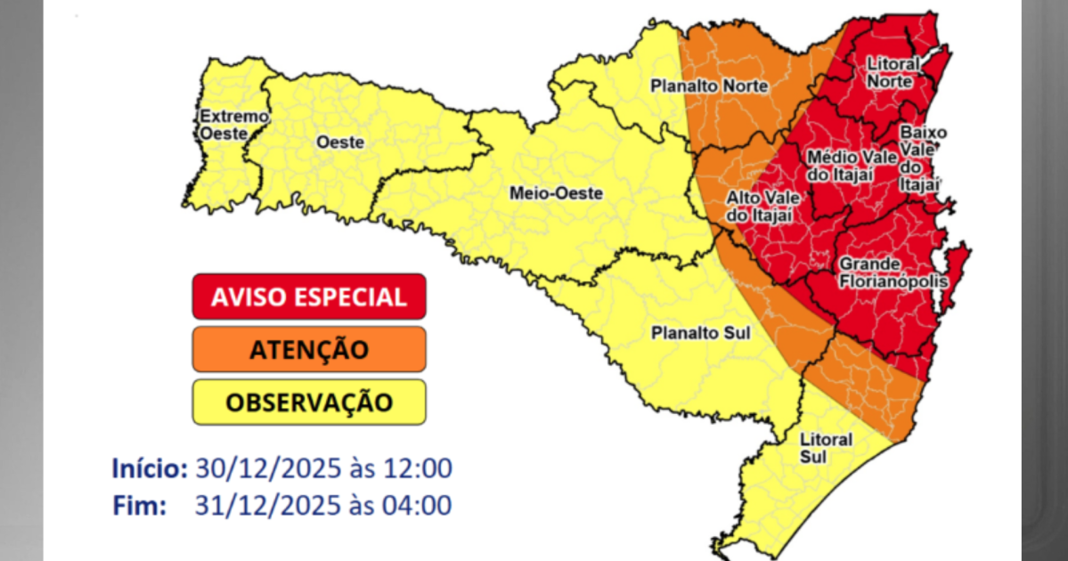 A Defesa Civil de Santa Catarina emitiu um novo alerta para a formação de temporais com chuva intensa e volumosa, especialmente no Litoral Norte, Vale do Itajaí e Grande Florianópolis, nesta terça-feira (30).
