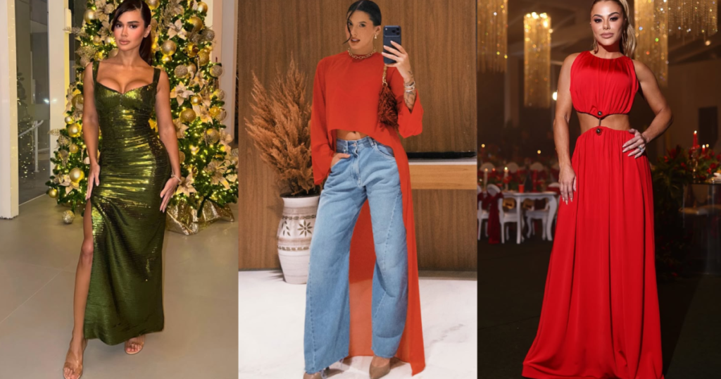A paleta de cores dominou as peças: que variaram entre tons de vermelho — que entraram em vestidos, blusas e saltos — e verde, que combinaram com os pinheirinhos enfeitados. Entre eles Ana Castela, Poliana Rocha, Juju Salimeni, Péricles e Mônica Martelli mostraram nas redes sociais as escolhas para a grande noite.