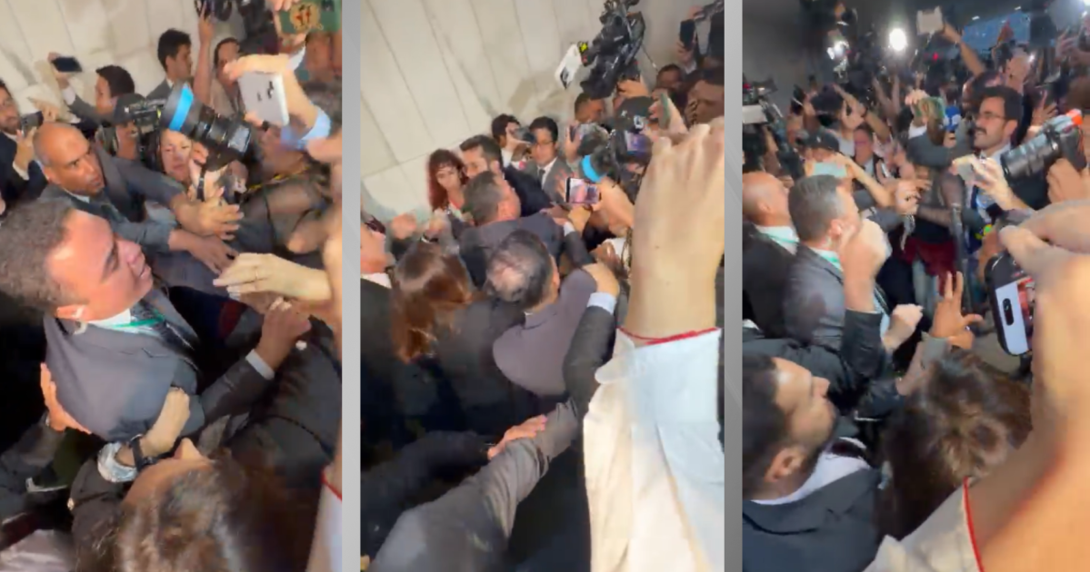 A situação foi registrada em vídeo. A Polícia Legislativa manda os jornalistas recuarem. Diante da recusa, um dos seguranças passa a empurrar os profissionais de forma truculenta, homens e mulheres, até abrir espaço para a retirada do parlamentar.