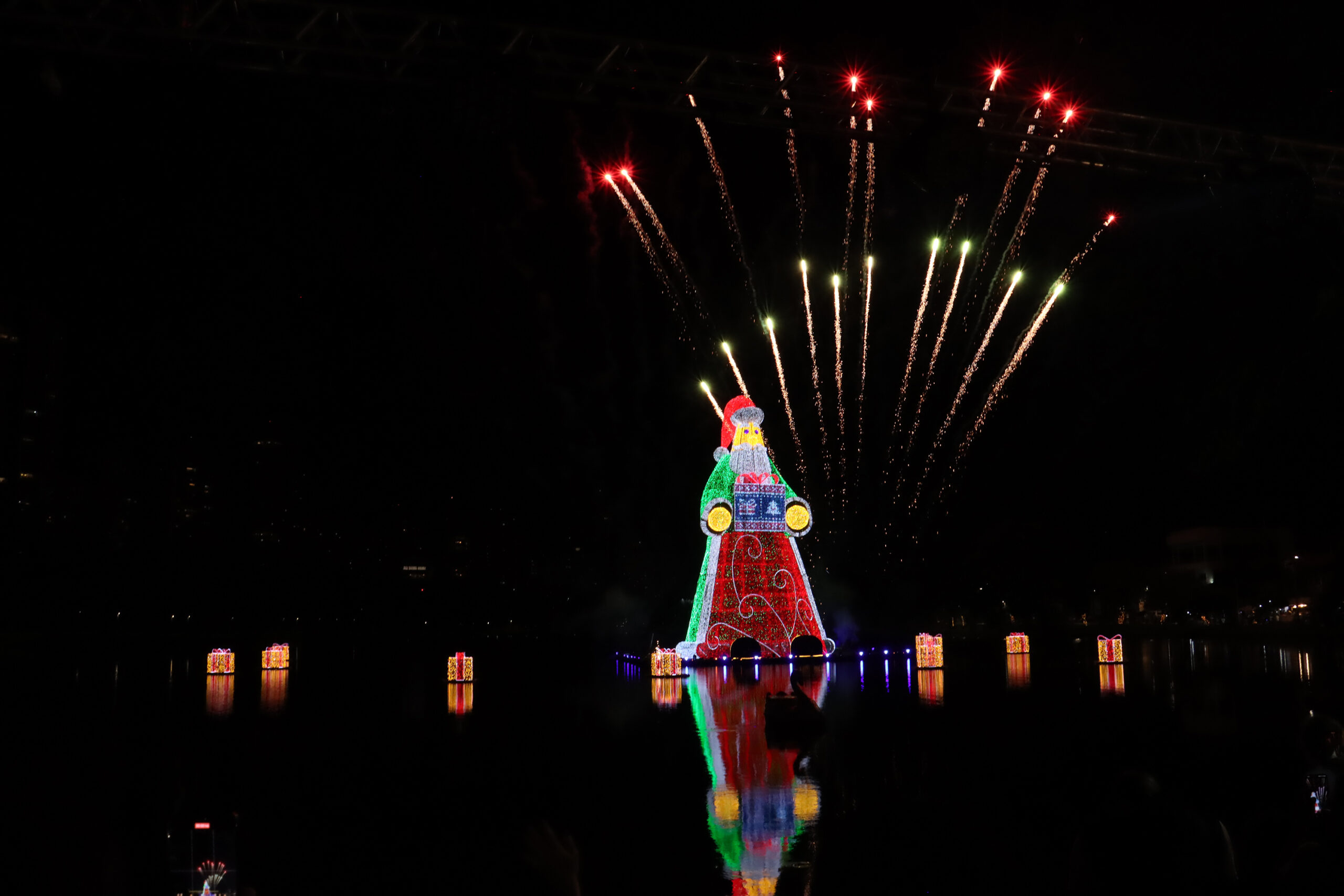 O investimento público ficou em R$ 1,8 milhão apenas para a escultura; somada à decoração completa da cidade, a conta alcança R$ 4,3 milhões. Instalado sobre uma plataforma flutuante no Lago Igapó, o gigante permanece sobre as águas até 6 de janeiro. O calçadão no centro da cidade também ganhou atração. Um uma roda-gigante de 22 metros, com 46 cadeiras e capacidade para 56 pessoas, foi inaugurada na segunda-feira (8), junto ao início do horário estendido do comércio de rua, até às 22h.