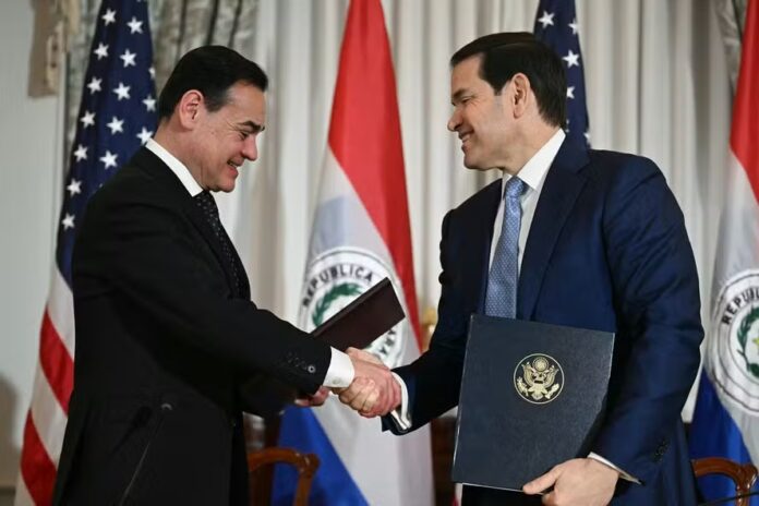 Secretário de Estado dos EUA, Marco Rubio (à direita), e o ministro das Relações Exteriores do Paraguai, Ruben Ramirez Lezcano (à esquerda), apertam as mãos em Washington –