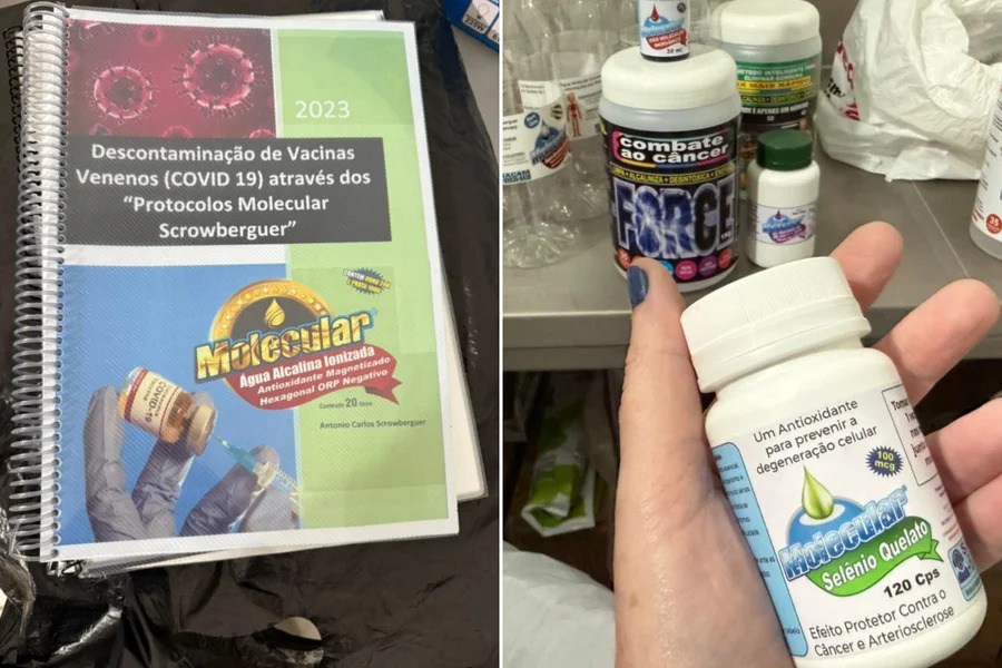 Entre os materiais identificados estavam uma água denominada “molecular”, além de azeite, sabonete, sal, amaciante e sabão de roupa. Segundo a polícia, os produtos eram divulgados com a promessa de propriedades capazes de tratar doenças.